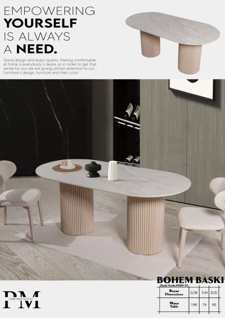 Modern çizgileriyle dikkat çeken bu masa, sağlam gövdesi ve zarif detaylarıyla evinizin en özel alanlarına şıklık kazandırır.